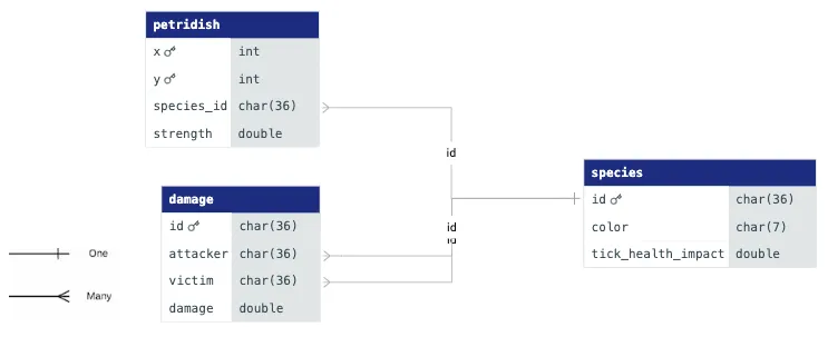 - Species table represents the organisms in the Petri Dish. Each species has a primary UUID key (id), color as a hex string (color), and a