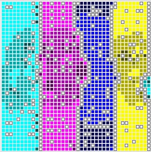 - If a cell is unoccupied at the beginning of the tick, if it has 3-5 occupied neighbors, then that cell will be given life in the form of the species which has the highest count of neighbors. New cells are always born with 1.0 strength. If there is not a dominant neighboring cell species (one species count that is higher than all others), then the cell will remain empty.