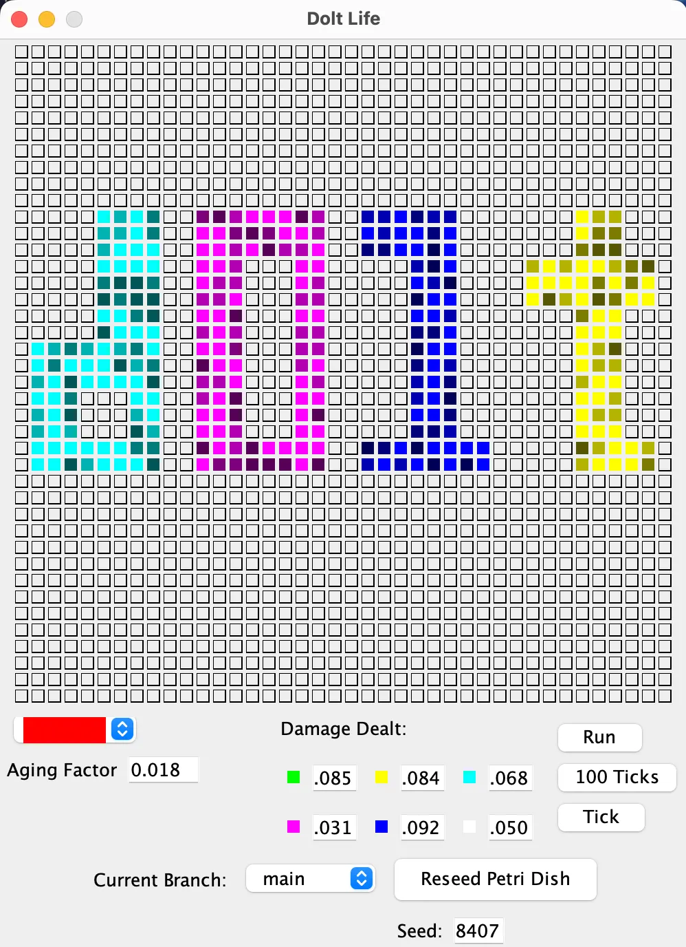 Similar to Conway’s Game, The Dolt Petri Dish has a set of simple rules with define how cells live and die.