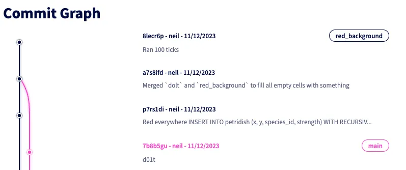 The merge started from a commit which is the clean_slate branch on DoltHub. It’s a commit with no rows in the petridish table. I then build up the d01t word tediously with SQL commands to fill rectangles, the details of which can be found in the commits themselves. That is all on the main branch. The on red_background branch, which was started at clean_slate, I filled every cell with the Red Species: