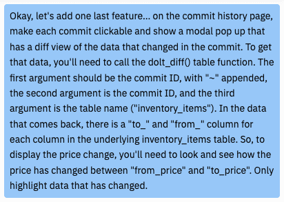 Let's add one more feature to our commit history UI. We'd like to see exactly what data changed in each commit. Dolt makes this really easy and provides several system tables and functions that allow you to easily query diffs. Here's what I asked Replit to build:
