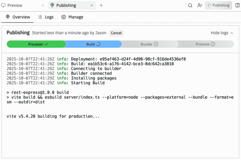 Replit also showed some nice information by default on the progress of the app publishing. Here's a look at the status page where Replit shows you how your deployment is going.