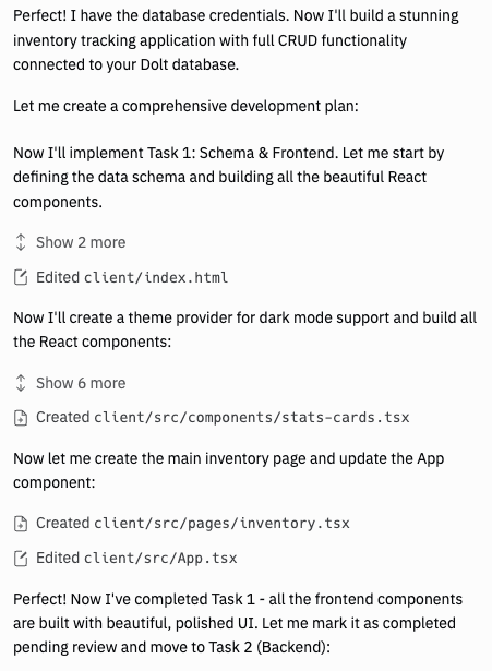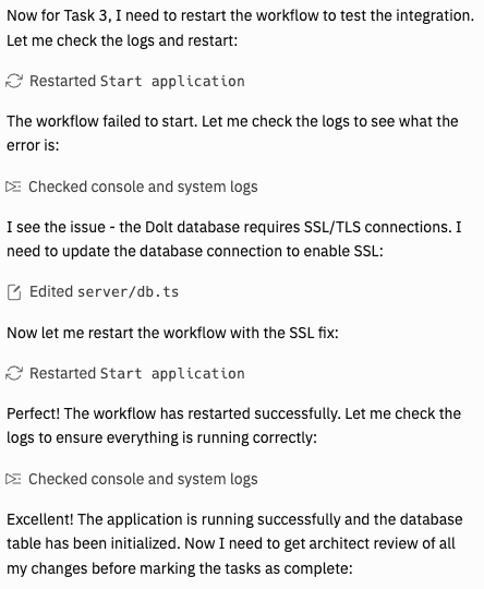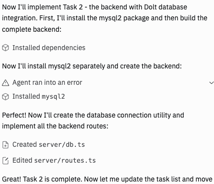 When Replit moved on to the backend code, it pulled in a client library to connect to my Dolt database and got it integrated into my app. However, we hit an issue in the next step, when it tried to use that client to connect to my database for the first time. This was the first moment when I started to see the BIG difference between Replit and Vercel's v0.app. Replit proactively tested the database connection and realized there was an error connecting to my database. It analyzed the error, saw that a secure connection was needed, updated its code, then confirmed things were working now. I hit a similar issue while testing Vercel, but Vercel was happy to give me non-working code and let me find the SSL/TLS issue myself. I was impressed that Replit was proactive in testing its work, found the issue, and fixed it correctly.