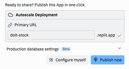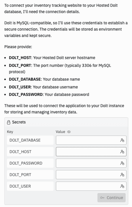 Replit made it very easy to configure a connection to an external Dolt database. After I gave it the go ahead to get started building the app, the first thing it asked me for was how to get connected to the Dolt database.