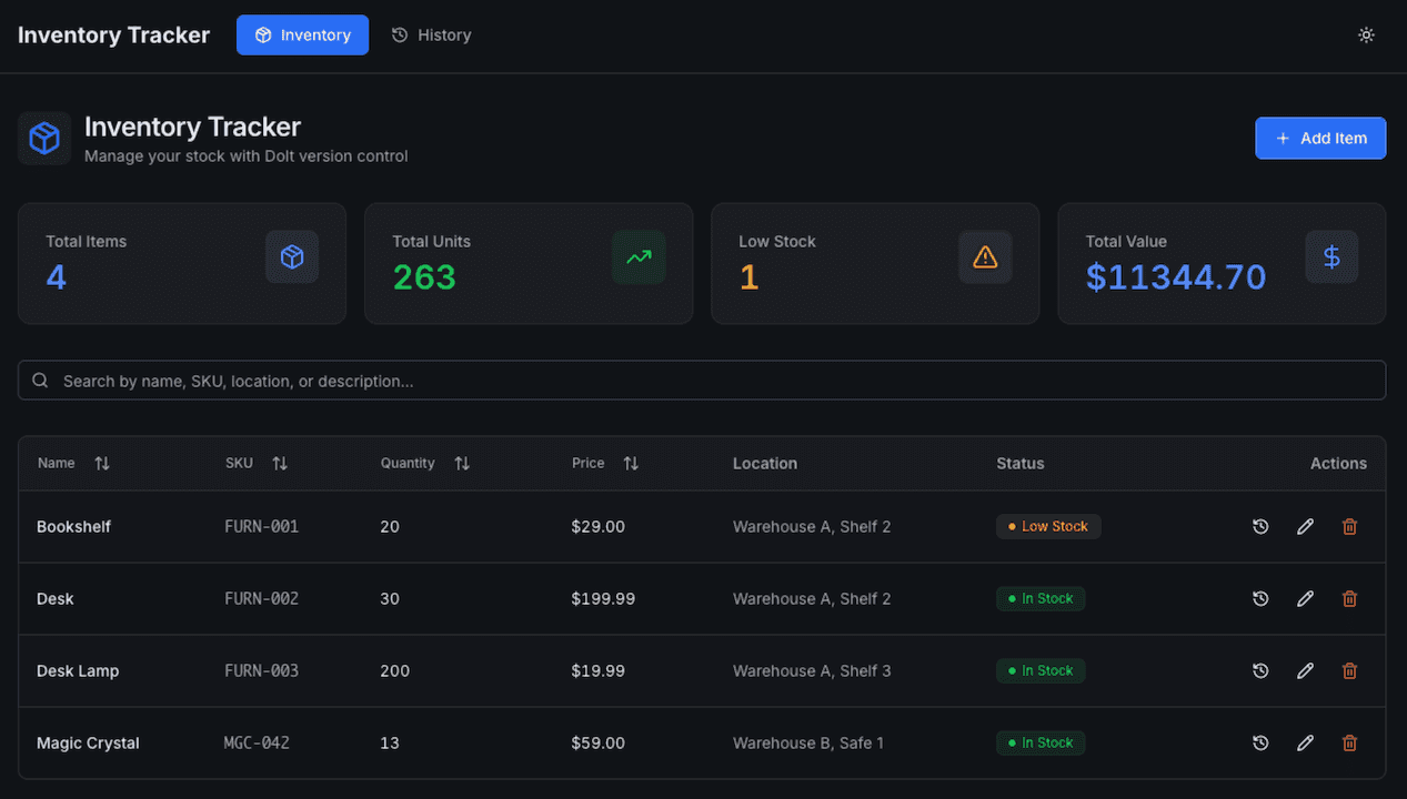 Here's a look at the finished inventory tracking web app that Replit created. I didn't give Replit any instructions or feedback on the UI style, and I think the UI it created turned out a bit nicer and more modern looking than what Vercel's v0.app created. Perhaps I'm just a sucker for a dark theme UI though.