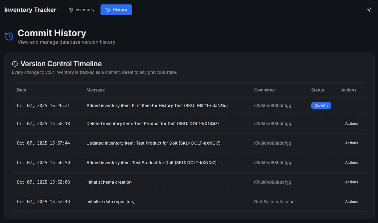 Just like in Git, Dolt tracks all changes through a commit graph. The first version control feature we want to add is showing this commit history. Here's the prompt I gave Replit: