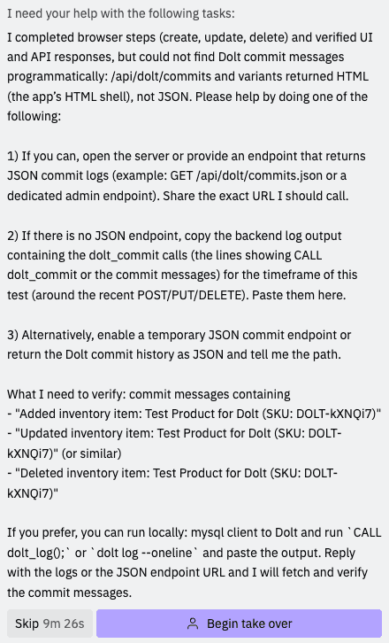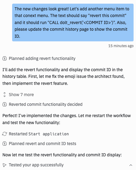Replit also seems to detect when it can't sufficiently test. I was pleasantly surprised when Replit asked me for help testing a change when I asked it to add calls to dolt_commit()