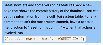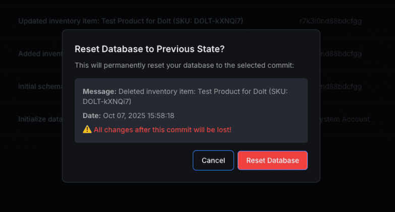 Each commit (except for the current commit) includes an action to "reset to this commit". Just like in Git, Dolt allows you to reset the current tip of a branch to any other commit in the graph. Replit did a great job coming up with the UI, including the descriptive text for the action.
