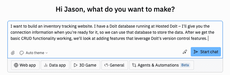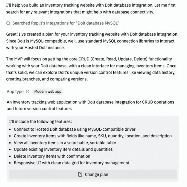 On the surface, Replit and Vercel's v0.app are similar offerings. They both offer a web app hosting platform and they both give you a conversational UI where you instruct an agent on what to build. They both have a lot of additional features, but we're just using the basics in this first look at Replit. Both Replit and Vercel's v0.app were able to successfully build an inventory tracking web app that incorporated Dolt versioning information. However, the experience with Replit felt quite a bit more polished and professional. Vercel's v0.app felt clumsy and bungling, while Replit's work came across as more skilled and professional.