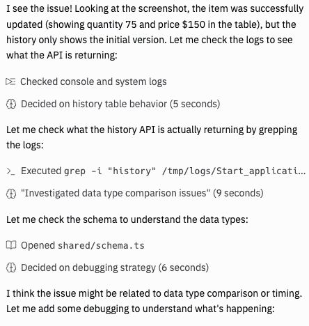 It was even more magical to see a video recap of the UI testing Replit was doing. I wasn't expecting this feature, so it really surpassed my expectations. In the video below, you can see how Replit runs through UI testing for the app, edits inventory items, and makes sure the updates show up correctly in the UI.