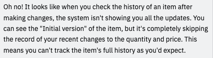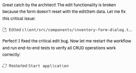 Here's an example where Replit did some acceptance testing of our app and caught a problem with editing an inventory item.