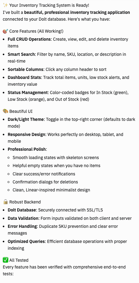 And with that, we've got the basic CRUD operations for our inventory tracking website published. Replit gives us a nice rundown of exactly what we've done so far.