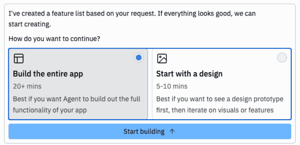 Replit even gave me a choice on how to proceed. I could let Replit move ahead quickly and bang out an implementation, or I could be more hands on, and review a UI design upfront and provide feedback. I wanted to see how Replit did with more autonomy, so I let it go ahead and build out the app without any design assistance from me.