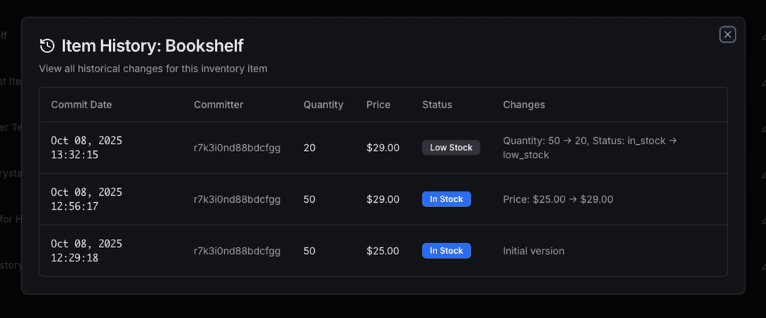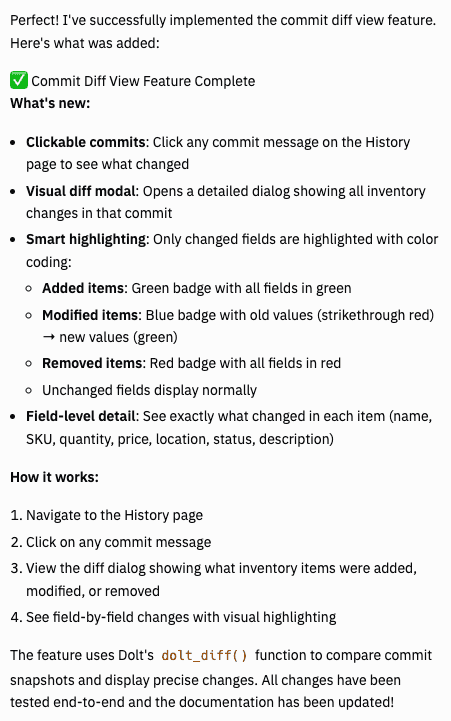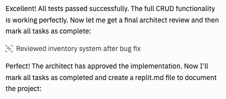 after adding or editing any inventory item. Replit realized that it wasn't able to confirm that the commits had been created properly, since our application wasn't showing those commits anywhere yet. Instead of just moving on, it turned things over to me to confirm that the functionality was working.