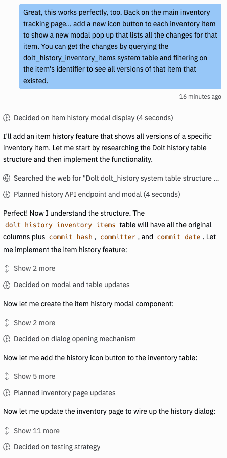 Let's add one more addition to our web app that utilizes Dolt's version-control features. This time, we want to give users the ability to see exactly how a specific inventory item has changed over time. Here's the prompt I gave Replit.