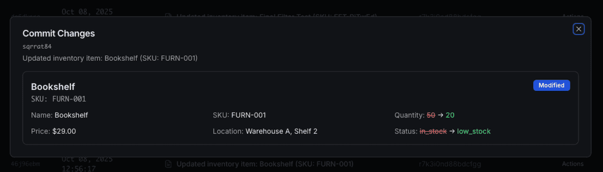 table function to pull this data and created the UI below that makes it easy to see how inventory attributes changed in a commit.